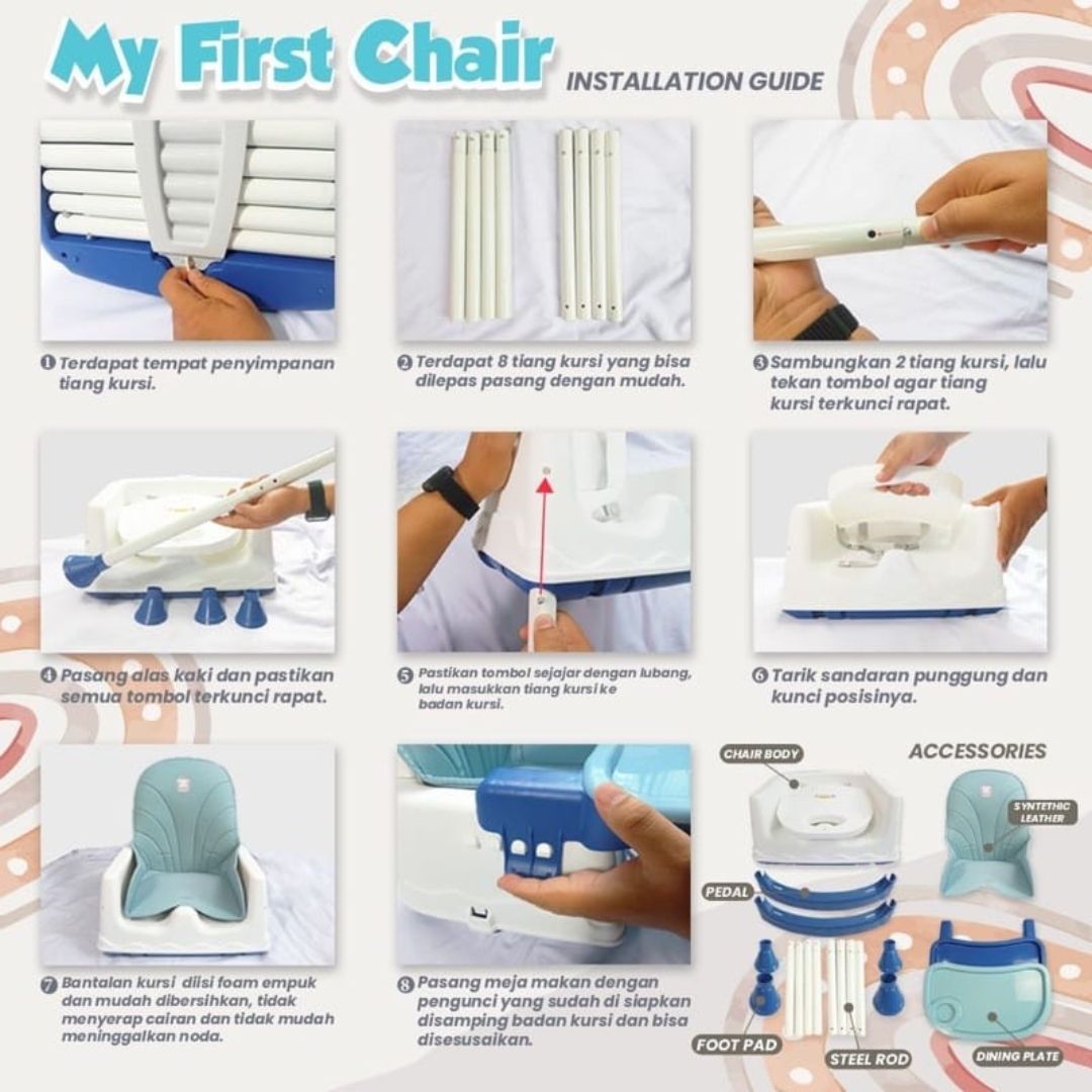 10. Berat maksimal saat posisi high chair 30 kg dan saat posisi di lantai tanpa kaki 50kg.