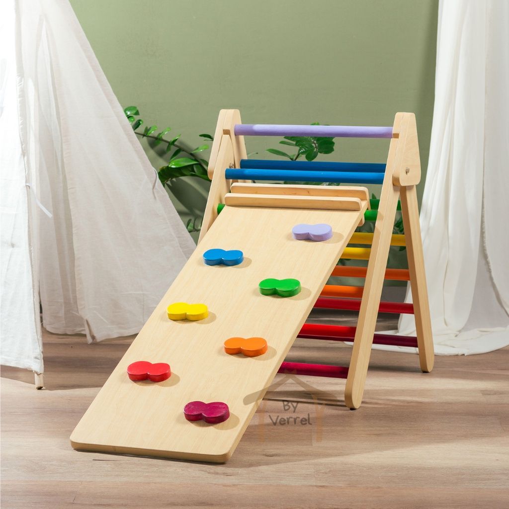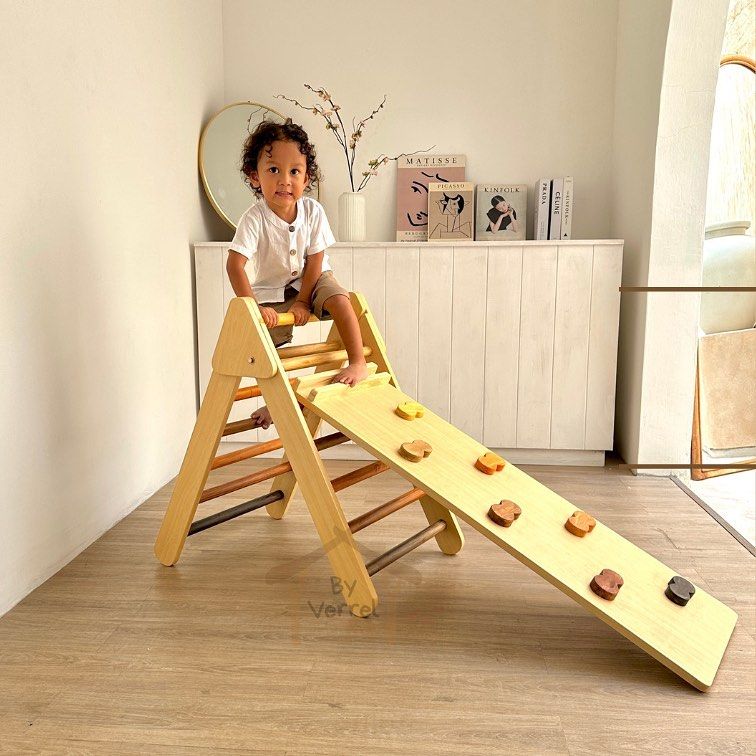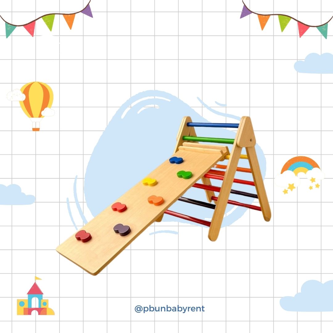 Salah satu mainan anak yang memfasilitasi kebutuhan perkembangan gross motor anak, pikler triangle ini bisa dipakai dari anak umur 9 bulan ketika belajar merangkak ya parents.